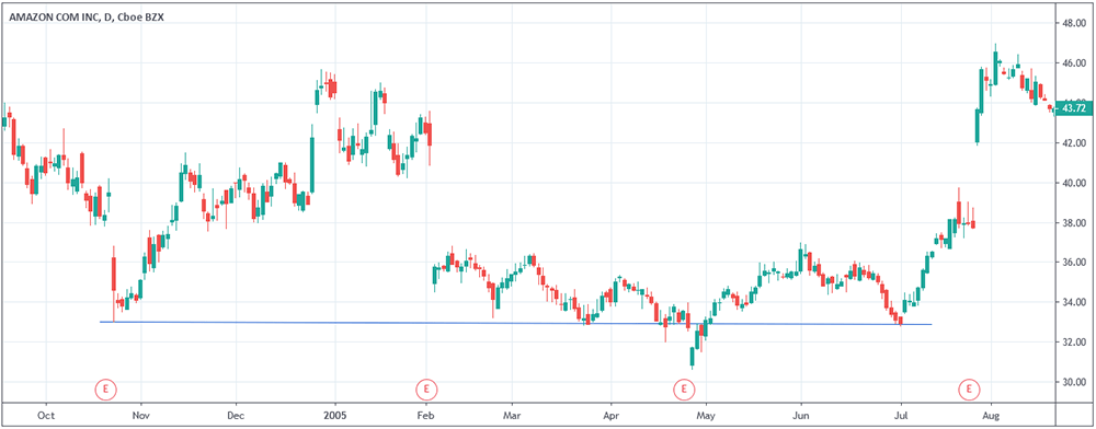 In the example above, we have Amazon with three strong points of support. However, even with three solid connections, it is always good to remember these areas of identifiable buying pressure are only indicators of repeatable behavior that can be broken. Support was found around the thirty-three dollar price point during the months of October, March, and July. However, in the month of April, the stock did break below the thirty-three dollar mark. It quickly rebounded in a few days, but it did drop below the identified support. Again, support lines are strong statistical markers; however, they are not written in stone, and variances should be considered before trading off of them.