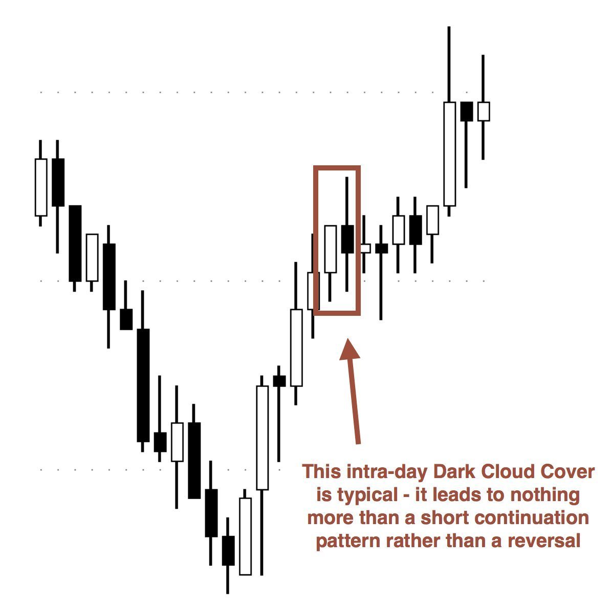 The Dark Cloud Cover becomes a challenging pattern intra-day because we cannot have the opening gap. Instead, we classify it this way: any pattern that trades at least halfway into the previous day but not more than the entire candle body.
