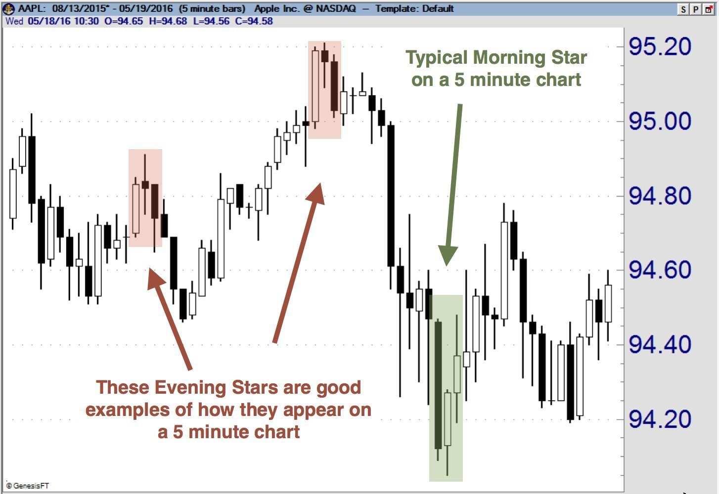 The evening star is the exact same principle. To identify an intra-day evening star pattern, just remove the expectation of the gap: