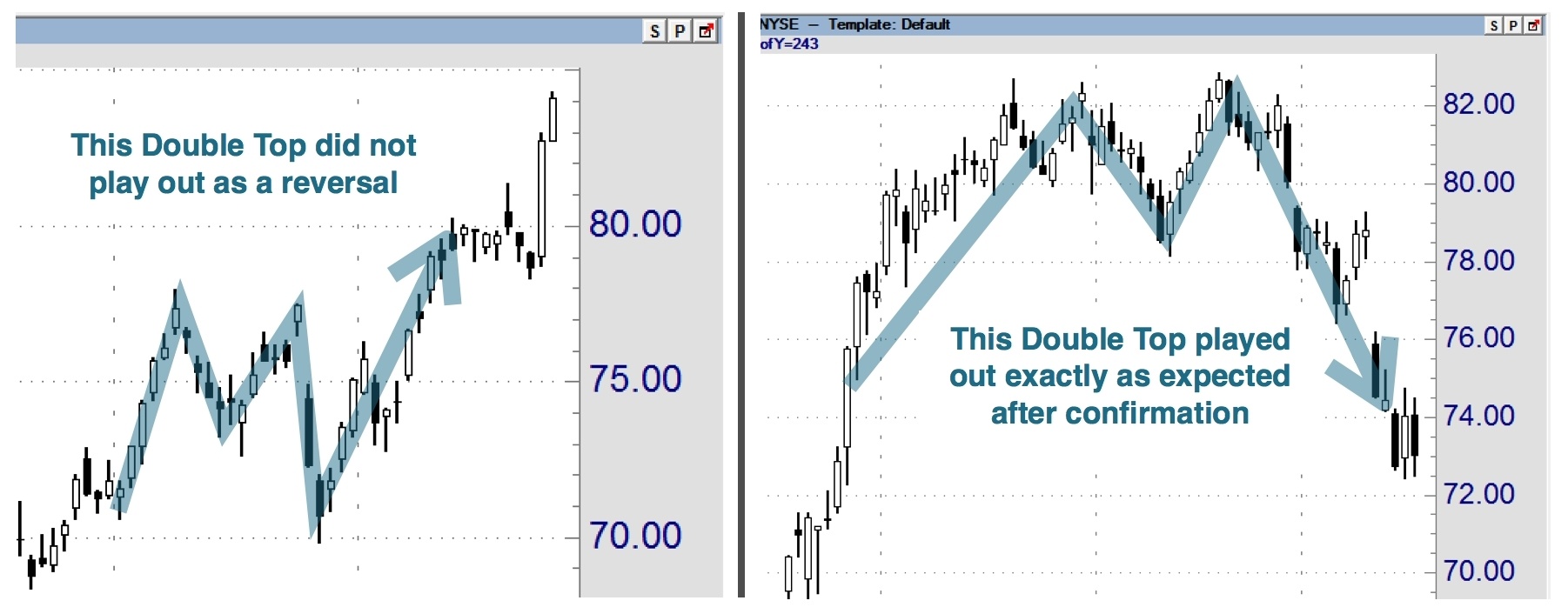 Here is an example of a confirmation on a double top vs. a “double-top” that never confirmed:
