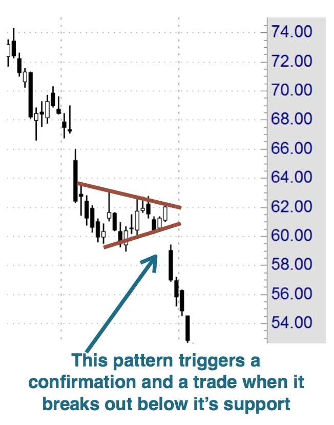 The confirmation for almost every pattern comes on the breakout of the pattern. When that pattern breaks the boundaries that have been containing it, the setup has changed. Now we move into a trigger. Now we know something bigger is going to happen. This is the confirmation we needed.